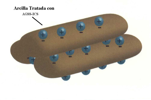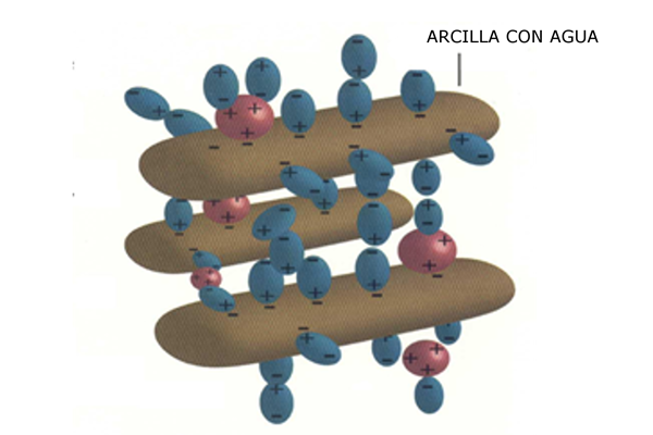 Los Iones de metales (en rojo) también se adhieren a las partículas de tierra o son retenidas entre las capas de agua absorbida.El agua absorbida actúa como lubricante entre las partículas de tierra lo que resulta en una baja capacidad de soporte y alta expansión pero al ser tratadas con productos especializados, se rompe la molécula de agua (H20) en H+ y OH-.